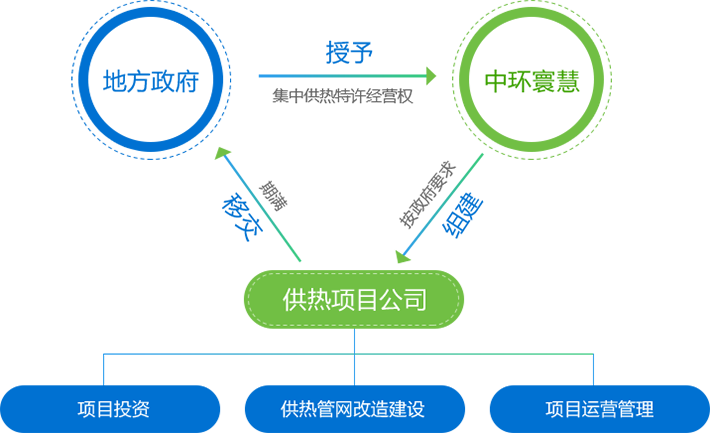 由地方政府授予集中供熱特許經(jīng)營權(quán),按政府要求組建供熱項目公司,承擔全部熱網(wǎng)改造、建設(shè)及項目運營管理工作。